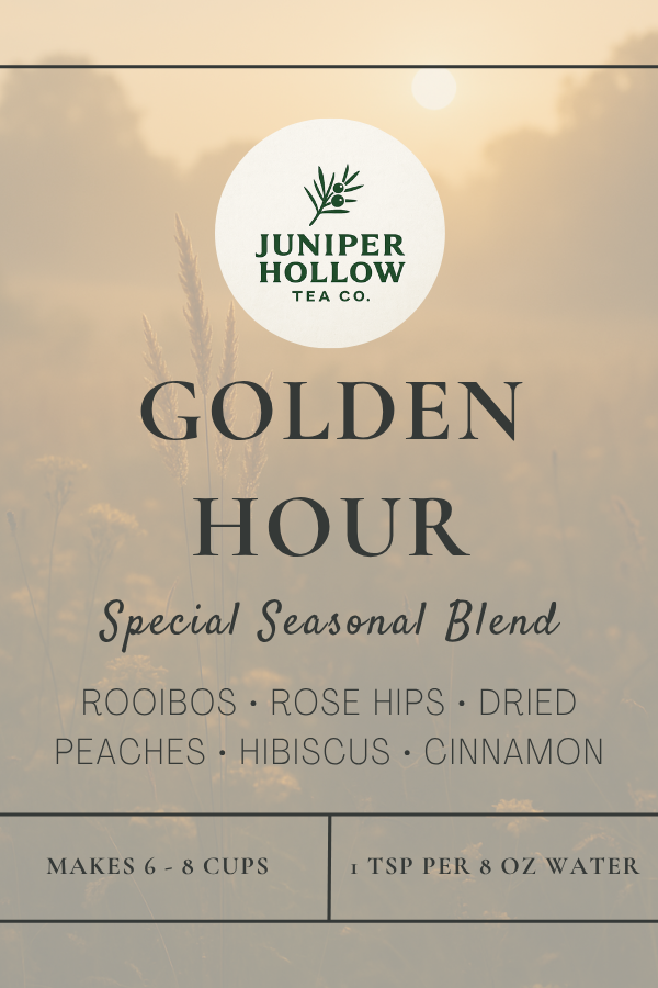 - Seasonal Blend -- Summer 2025 Golden Hour: A caffeine-free peach rooibos with hibiscus and warm spice